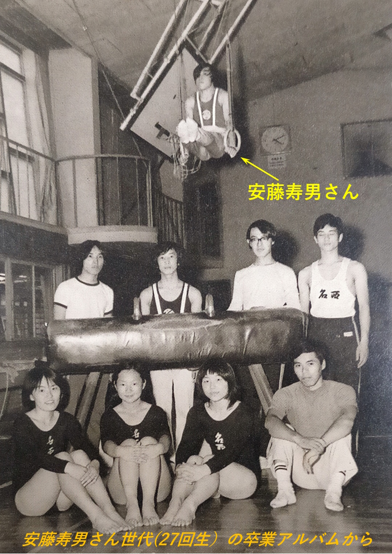卒業後は愛知県教員となり、最初の赴任校が名西高校でした。昭和49年4月のことでこの年の卒業生が名西27回生ですから第65回支部総会で講演される安藤寿男さん(27回生)の卒業アルバム(下写真、体育担当教諭)では右端に紅谷先生の初々しい姿が写っています。