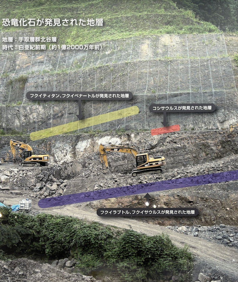 恐竜が生きていた頃に陸(川や湖など)でたまった地層(1億2千万年前の白亜紀の地層)の中でも、骨などが特にたくさんかき集められた部分(ボーンヘッド、福井県勝山市北谷町の手取層群北谷層)を発見(1989年、右写真)し、福井県が早くから大規模で集中的な発掘を行い続けてきたこと。